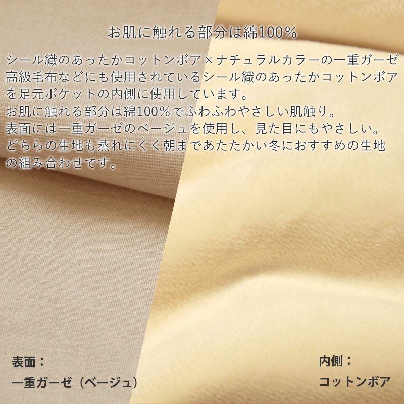 高級毛布などにも使用されているシール織のあったかコットンボアを足元ポケットの内側に使用しています。お肌に触れる部分は綿100%でふわふわやさしい肌触り。表面には一重ガーゼのベージュを使用し、見た目にもやさしくナチュラルカラー。どちらの生地も蒸れにくく朝まであたたかい冬におすすめの生地の組み合わせです。