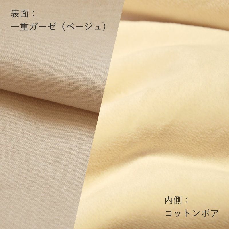 高級毛布などにも使用されているシール織のあったかコットンボアを足元ポケットの内側に使用しています。お肌に触れる部分は綿100%でふわふわやさしい肌触り。表面には一重ガーゼのベージュを使用し、見た目にもやさしくナチュラルカラー。どちらの生地も蒸れにくく朝まであたたかい冬におすすめの生地の組み合わせです。