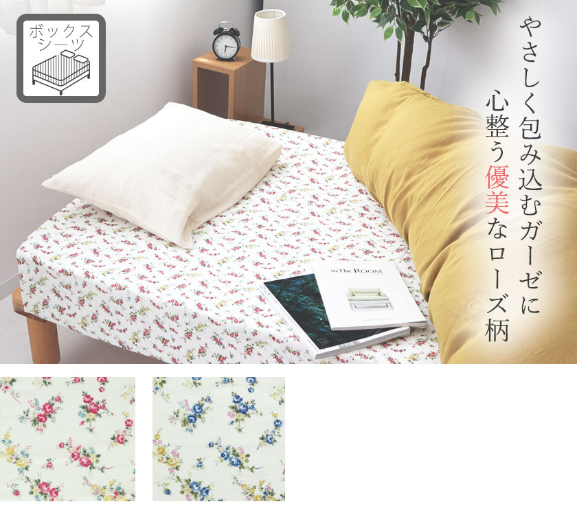 洗うたび、ふっくらふわふわな心地よさ!柄なので汚れが目立ちにくく、優美なローズ柄で寝室が一気に華やかになる、綿100%ダブルガーゼのボックスシーツベビー。日本製