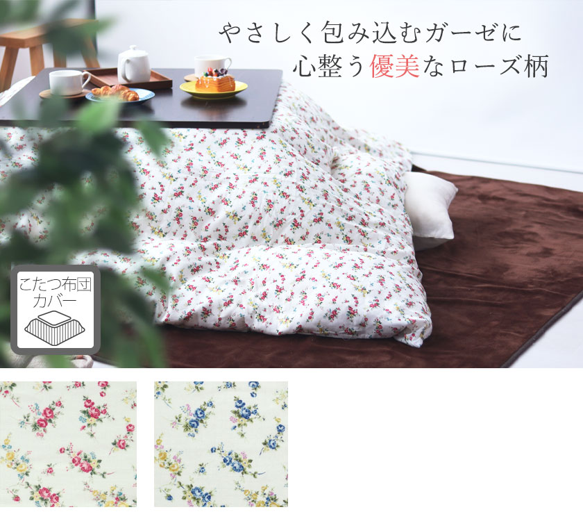 英国を想わせるローズ柄で空間が一気に華やか。洗うたび、ふっくらふわふわな心地よさ。綿100%ダブルガーゼのこたつ掛け布団カバー長方形。日本製