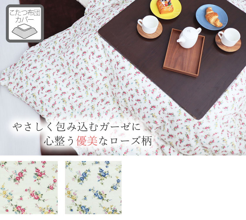 エレガントなローズ柄でお部屋が一気に華やか。洗うたび、ふっくらふわふわな心地よさ。綿100%ダブルガーゼのこたつ掛け布団カバー正方形。日本製