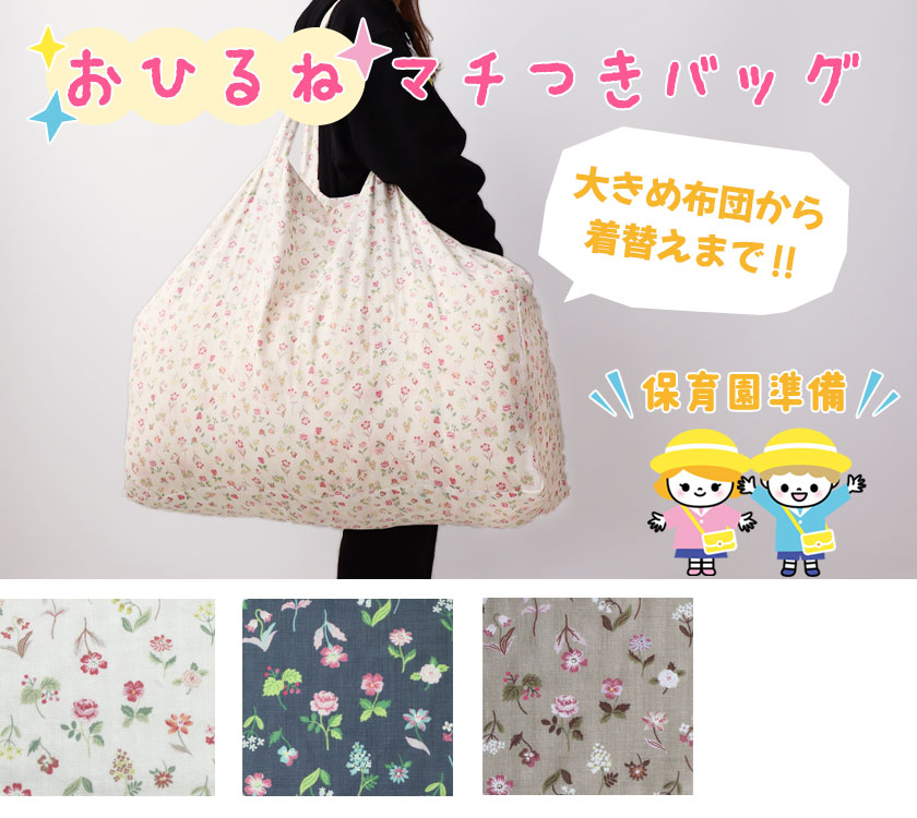 入園準備に!サイズを自由にお選びいただけるオーダーメイドでお好みの大きさにおつくりします。フレンチカジュアルなかわいいお花がぎゅっと詰まったお花柄。薄手の生地で、くるくるっとまとめたり折りたたんだりとコンパクトに収納しやすく、持ち運びも楽々なバッグです。綿100%ダブルガーゼの日本製お昼寝布団バッグ。