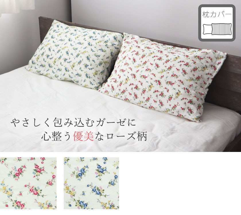 お花柄で汚れが目立ちにくく、洗うたび、ふっくらふわふわな心地よさ!セットでも一点だけでも優美なローズ柄で華やかな寝室に大変身!綿100%ダブルガーゼの枕カバーSサイズ。日本製