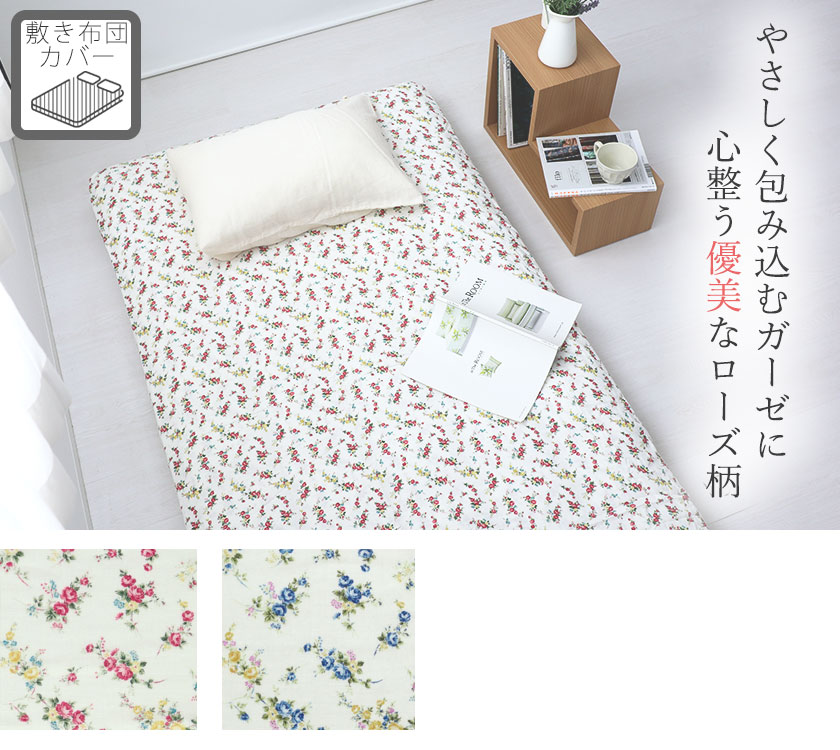 花柄で汚れが目立ちにくく、洗うたび、ふっくらふわふわな心地よさ!優美なローズ柄で寝室が一気に華やかになる、綿100%ダブルガーゼの敷き布団用ベビー。日本製