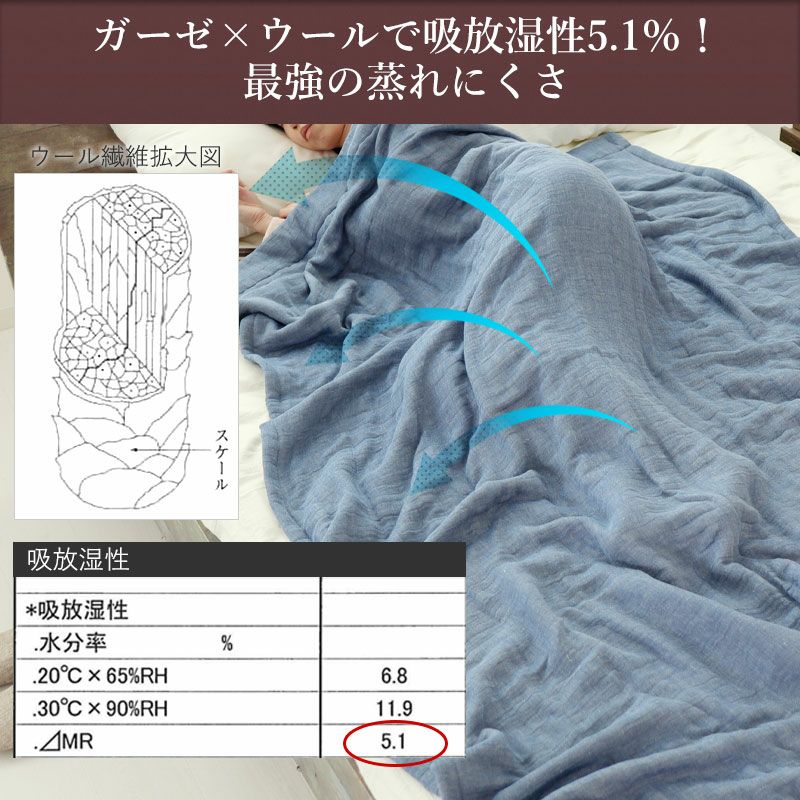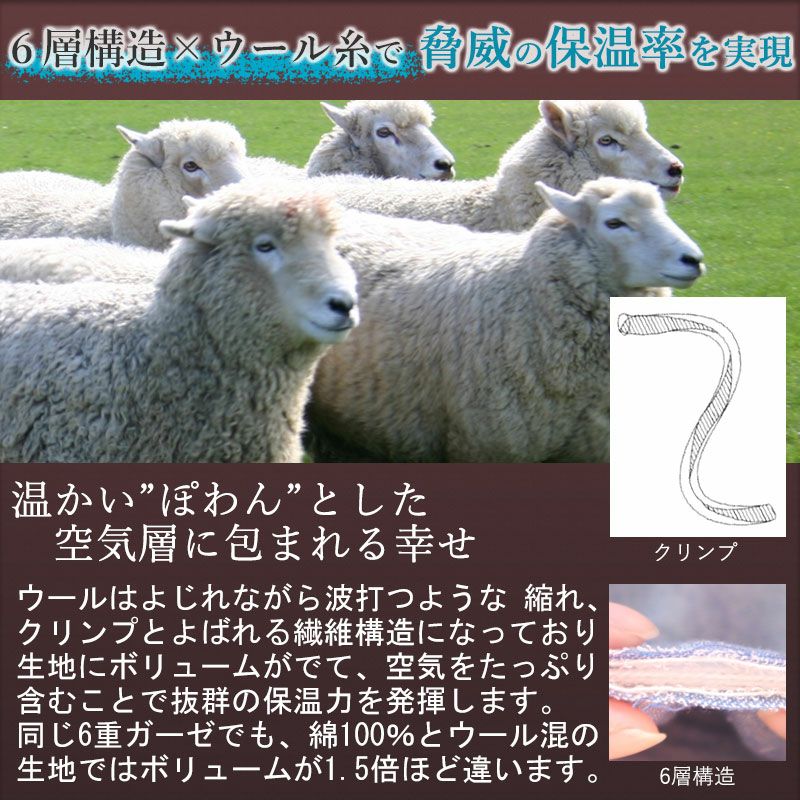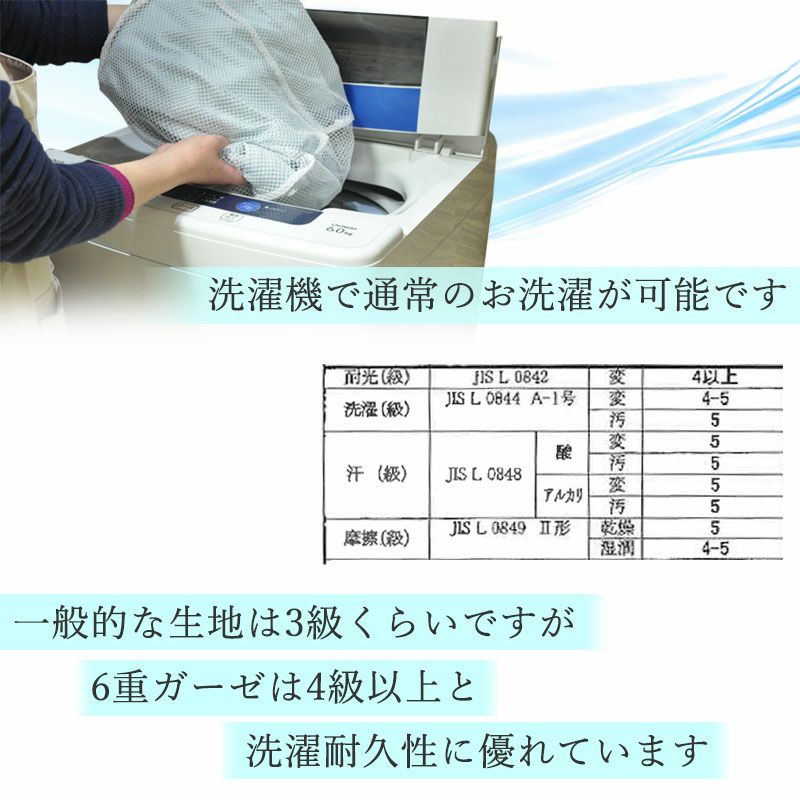 柔らかくふっくらとした肌触りのガーゼの内層にウォッシャブルウール糸を入れ、ウール混なのにチクチクしない生地です。洗うほどにふかふかと柔らかい風合いが増していく6重ガーゼ。ウォッシャブルウールを使用しているので、ご家庭で洗濯機で洗えるのも嬉しいポイントです。
