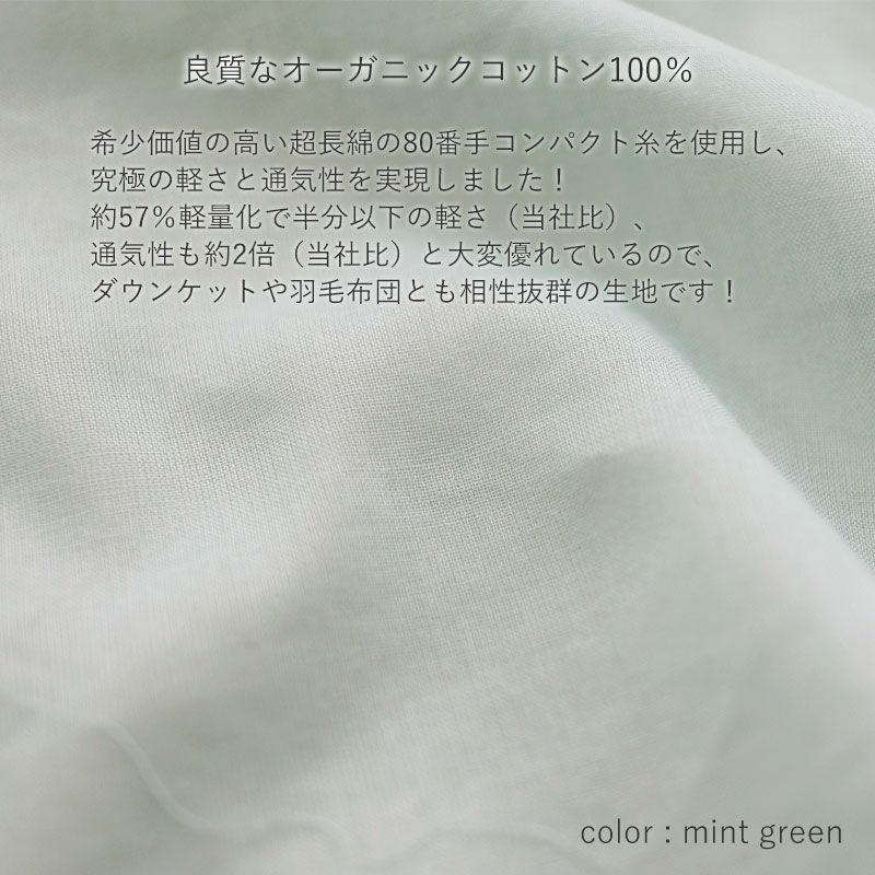 希少価値の高い超長綿の80番手コンパクト糸を使用し、さらに和晒加工をすることで、究極の軽さと通気性、そして柔らかさを実現!約57%の軽量化で半分以下の軽さ(当社比)で、するんとなめらかな肌触りのやさしいガーゼ生地です。