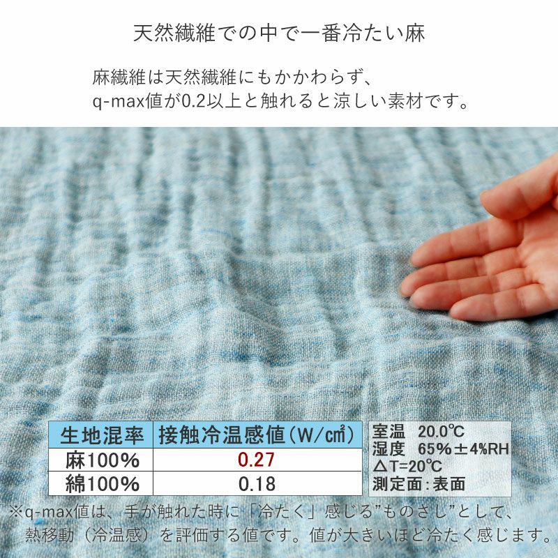 手が触れた時に「冷たく」感じる”ものさし”として、熱移動(冷温感)を評価するq-max値があります。q-max値が大きいほど肌に“接触”したときに冷たく感じます。麻繊維は天然繊維にもかかわらず、この値が0.2以上と触れると涼しい素材です。