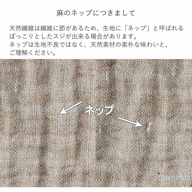 【麻のネップについて】天然繊維は繊維に節があるため、生地に「ネップ」と呼ばれる、ぽっこりしたスジが出来る場合があります。ネップは生地不良ではなく、天然素材の素朴な味わいと、ご理解ください。