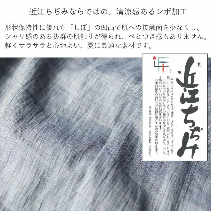 伝統の技法によって製織された近江ちぢみの生地に、昔ながらの匠の技と新しい技術を使って作り出された「しぼ」加工品です。形状保持性に優れた「しぼ」の凹凸で肌への接触面を少なくし、シャリ感のある抜群の肌触りが得られ、べとつき感もありません。天然繊維の麻のみが持つ爽やかな縮布は、軽くサラサラと心地よい、夏に最適な素材です。