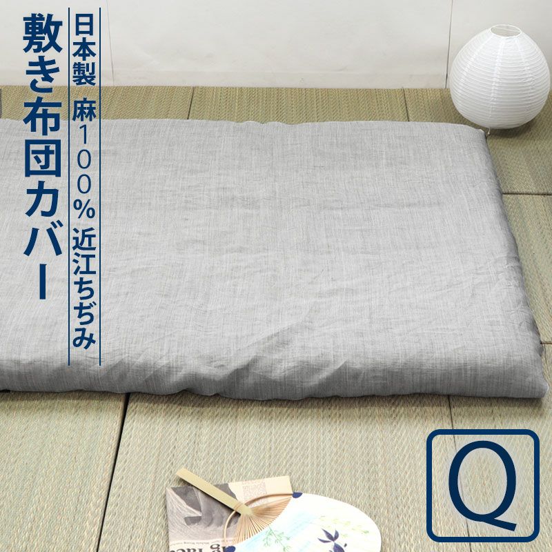 麻特有のシャリ感で涼感たっぷりの近江ちぢみからクイーンサイズの敷き布団カバーです!おしゃれで雰囲気のある先染め高級感たっぷりです。京都の職人が一枚一枚丁寧に縫製しています!