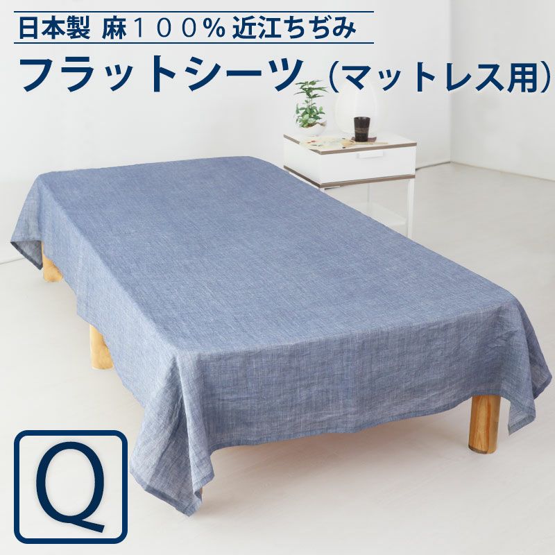 清涼感たっぷりの近江ちぢみのクイーンサイズのマットレス用フラットシーツです。麻ならではのシャリ感ではりつかず、優れた吸放湿性で快適に夏をお過ごしいただけます。安心安全の日本製でサイズオーダー対応!