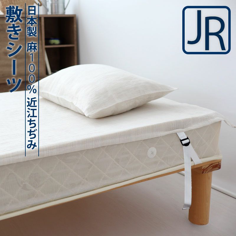 汗をかいてもむれにくい近江ちぢみ麻100%使用した、お洗濯も楽々な敷きシーツ(四隅ゴム付きシーツ)ジュニア・セミシングル。シャリ感のある肌触りで夏も涼しくさらっと過ごせる。日本製