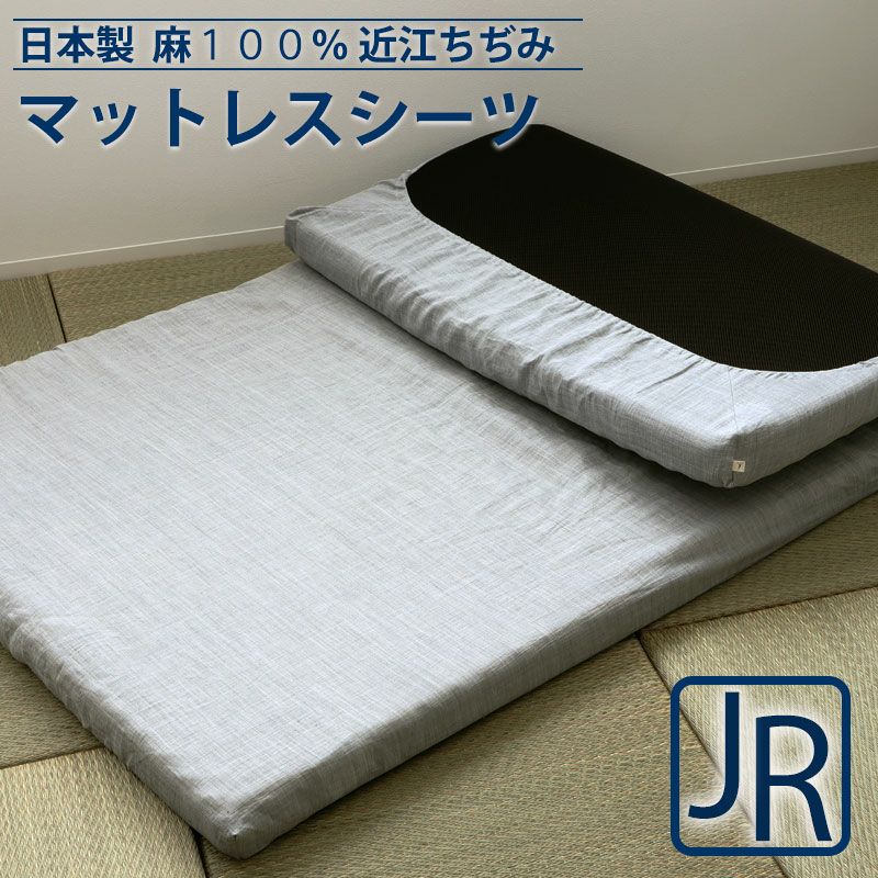 夏に人気の近江ちぢみ麻のジュニアサイズのマットレスシーツです。近江ちぢみならではのシボとシャリ感でべたつかずに爽やかです。幅、丈を調整できるセミオーダーメイド対応です。