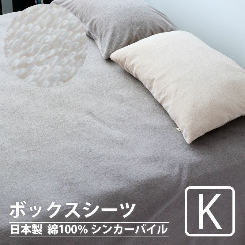 素肌にとっても気持ちよくふっくらふんわりで思わず寝ころびたくなります。肌にあたる部分はオーガニックコットン100%!やさしい色合いのカラーバリエーションで安心の日本製です!オールシーズンご使用いただけるシンカーパイルのボックスシーツキングサイズ。