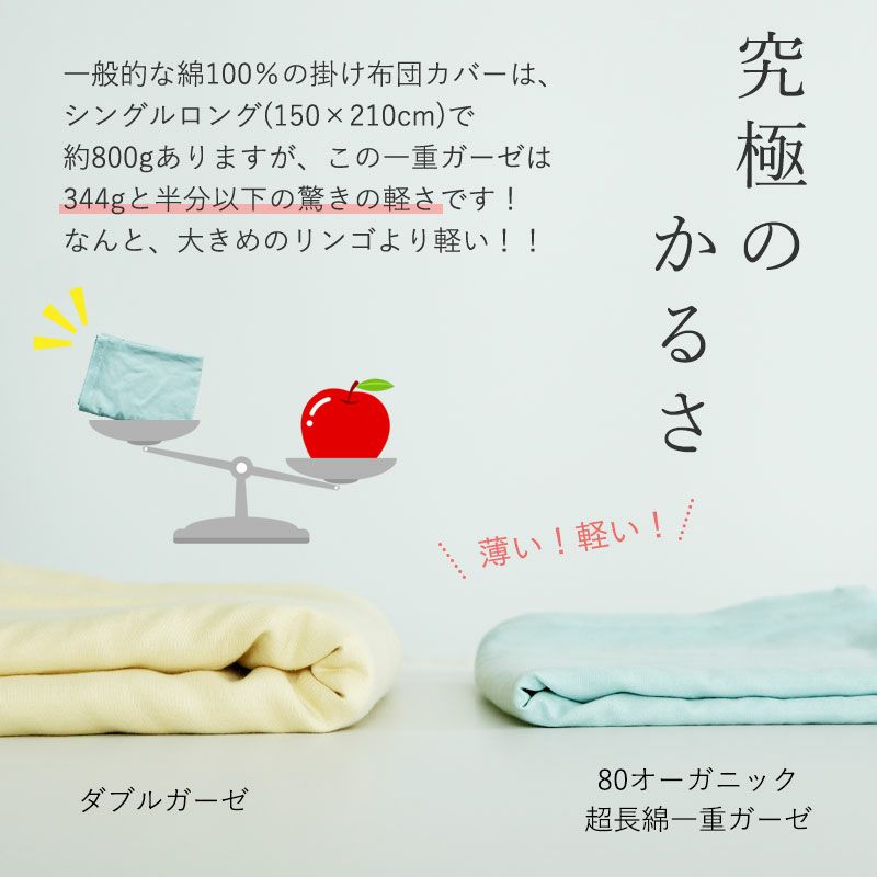 希少価値の高い超長綿の80番手コンパクト糸を使用し、さらに和晒加工をすることで、究極の軽さと柔らかさを実現しました!約57%軽量化で半分以下の軽さ(当社比)のカバーになりました。そして、通気性も約2倍(当社比)と大変優れているので、真綿布団のメンテナンスにもよく、夏に限らず通年お使いいただけます。