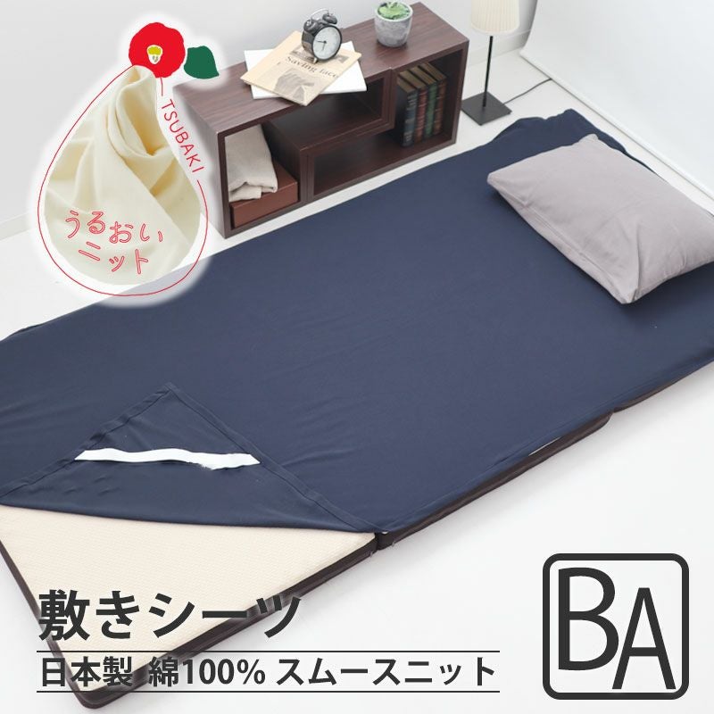 ふっくらやさしい風合いのニット生地で安心の日本製。椿油・植物由来エキス配合により保湿力としっとりとした肌触りを実現した美容ニット。綿100%使用の40オーガニックコットンで付け外しもお洗濯も楽々な、敷きシーツ(四隅ゴム付きシーツ)ベビーサイズ。