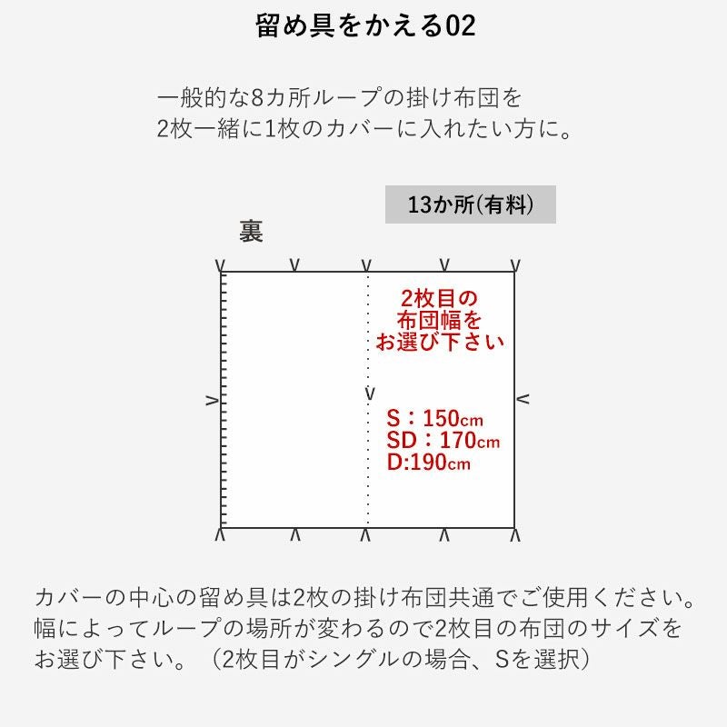 掛布団カバーとお布団とを固定する留め具の種類をかえられます。お布団によって数や位置の違うものがありますので、数を増やす場合は一部有料となります。