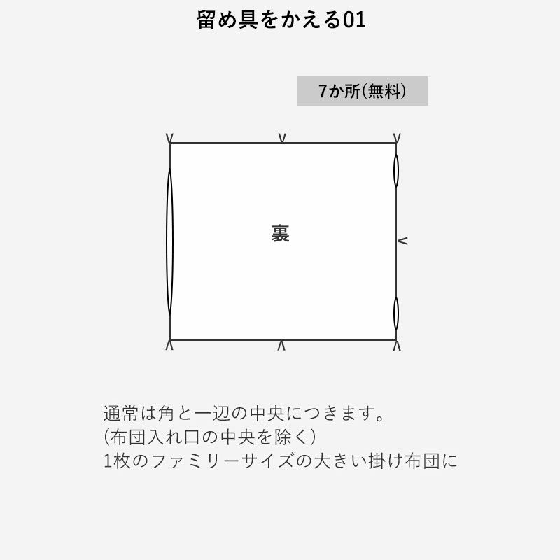 掛布団カバーとお布団とを固定する留め具をお付けできます。また、種類もかえられます。お布団によって数や位置の違うものがありますので、数を増やす場合は一部有料となります。