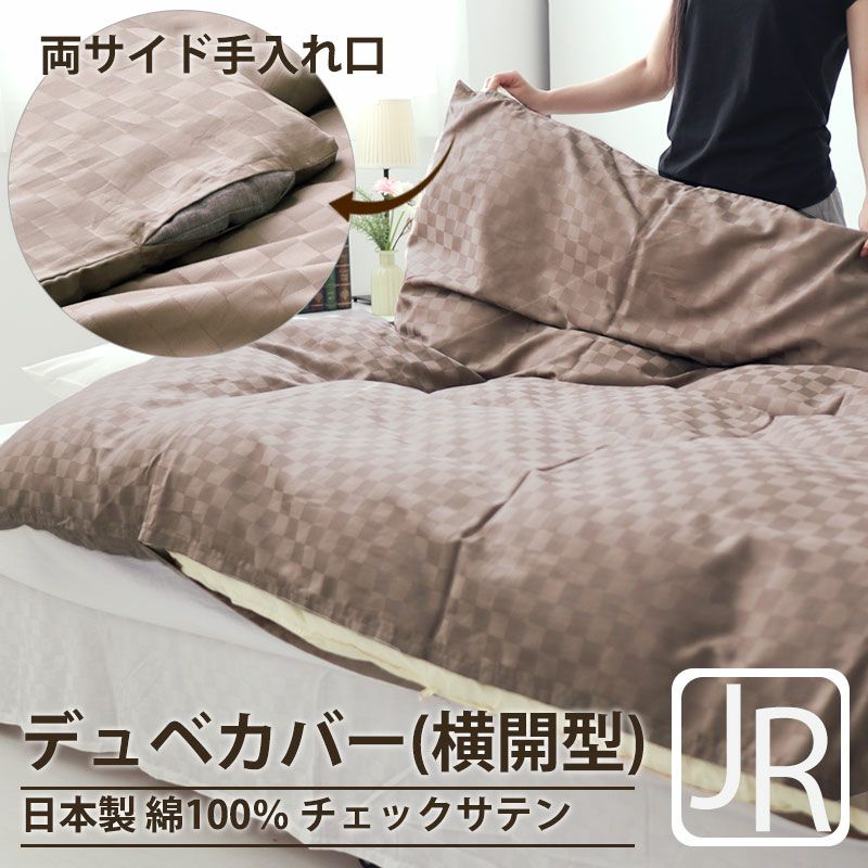 セットがしやすく、ホテルや旅館でも使用される横開型のデュベカバーでスタイリッシュな寝室に。昼夜織りの上質サテンのコントラストでつくる、ホテルライクな空間、綿100%日本製のジュニアサイズ、スタイリッシュな格子柄 chess