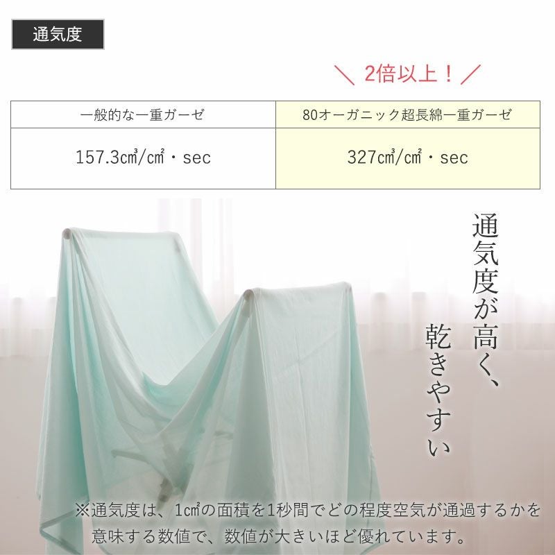 140本、150本と試織を重ね、軽いけど薄すぎない160本に辿り着きました!密度を表す数値、スレッドカウント※の高い生地がいいというわけではありません。この道70年以上の実績から生み出された一重ガーゼは究極の軽さと通気性をかねそなえた、高品質なガーゼです。ダウンケットや羽毛布団をお使いなのに、スレッドカウントの高い生地を使ってしまうと、羽毛がつぶれたり重すぎて快眠を妨げたりする場合もあります。