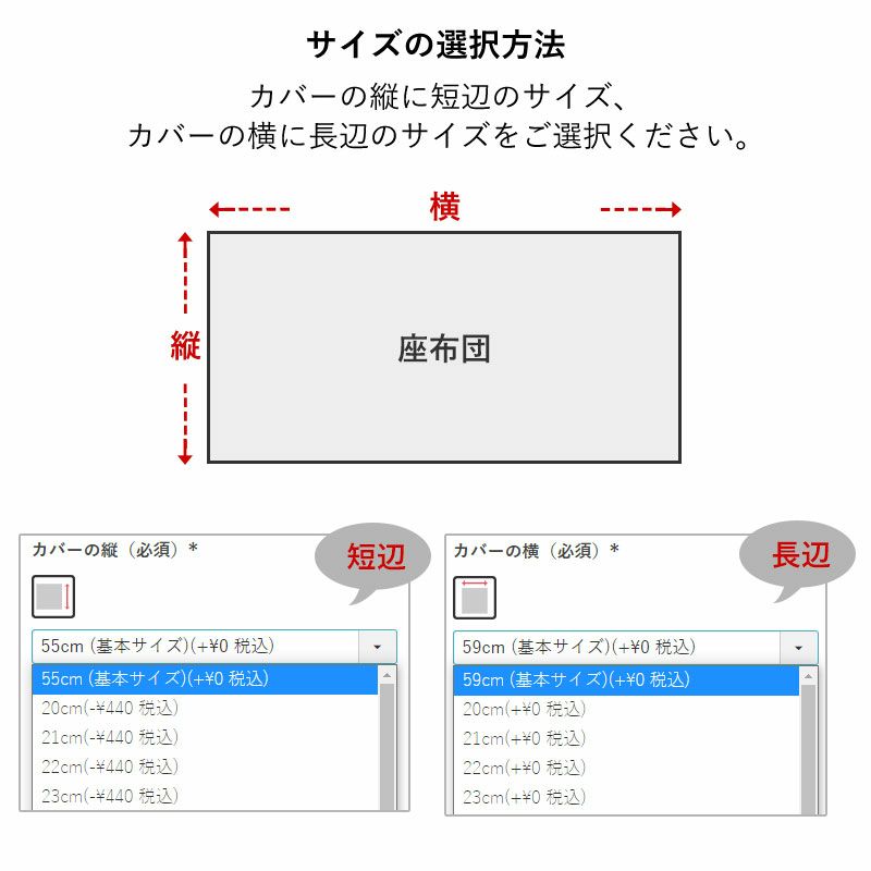 座布団の品質表示タグをご確認頂き、品質表示タグのサイズ通りに選択肢をお選びください。タグ表記がなかったり、サイズの計測が必要な場合はこちらをご参考になさってください。