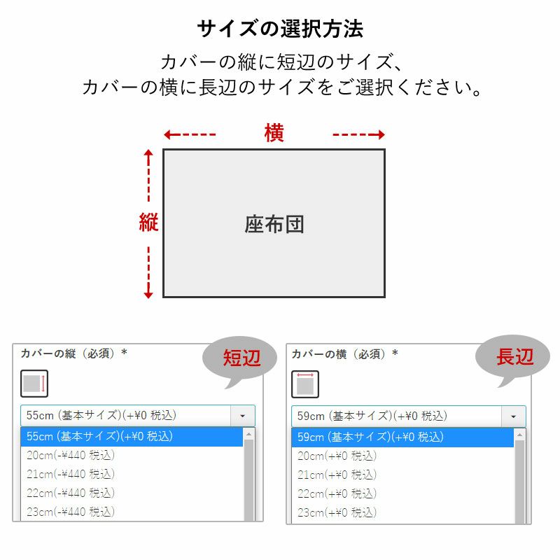 座布団の品質表示タグをご確認頂き、品質表示タグのサイズ通りに選択肢をお選びください。タグ表記がなかったり、サイズの計測が必要な場合はこちらをご参考になさってください。