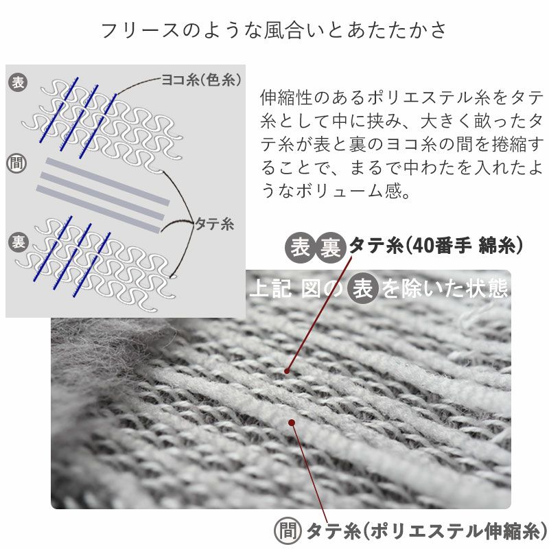 伸縮性のあるポリエステル糸をタテ糸として中に挟み、大きく畝ったタテ糸が表と裏のヨコ糸の間を捲縮することで、まるで中わたを入れたようなボリューム感。綿なのにふわふわと柔らかく、まるでフリースのような風合いと触り心地です。