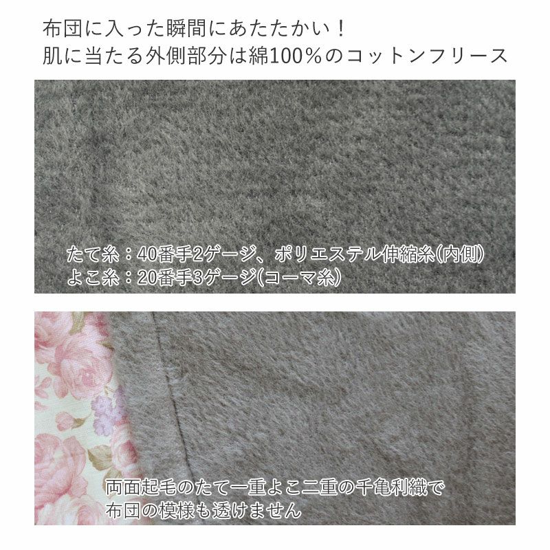 フリースの心地よい肌触りを綿で実現しました!高い保温力とふっくらふわふわの起毛で寒い冬に包んでくれるようなやさしい肌触り。肌に触れる部分は綿100%なので、汗をかいても蒸れにくく快適にお過ごしいただけます。