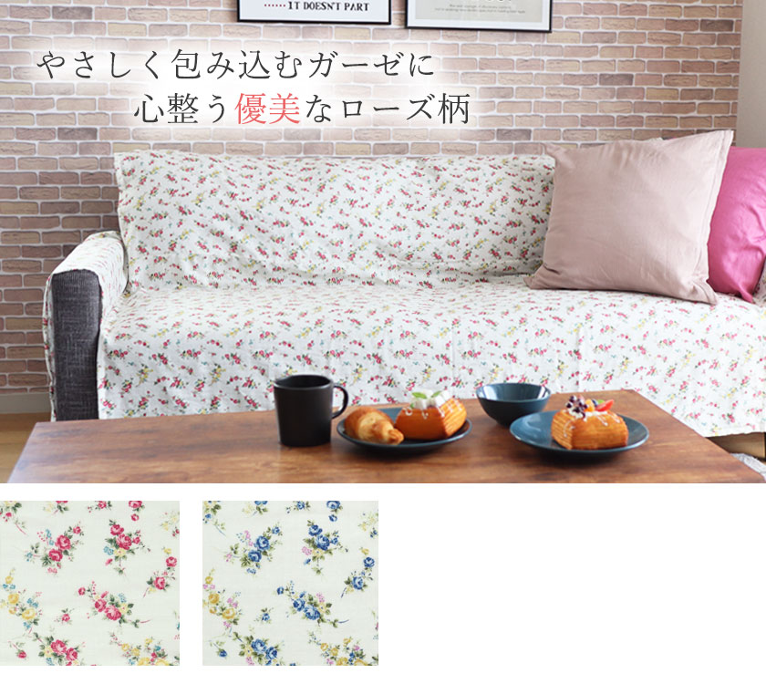 掛けるだけでカンタンな一枚物なので取り替え楽々で丸洗いできないソファの汚れを防ぎます。洗うたび、ふっくらふわふわな心地よさ。エレガントなローズ柄でお部屋が一気に華やかな綿100%ダブルガーゼのソファカバー。日本製