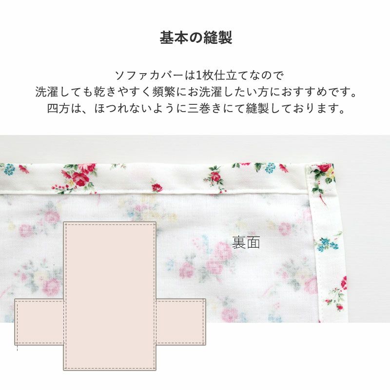 ソファカバーは1枚仕立てでゴムなどがない為、洗濯しても乾きやすく毎日お洗濯したい方におすすめです。四方は、ほつれないように三巻きにて縫製しております。