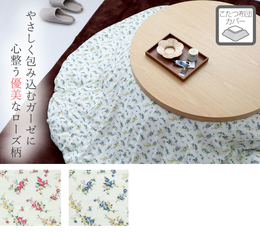 綿100%ダブルガーゼのこたつ掛け布団カバー円形。エレガントなローズ柄でお部屋が一気に華やか。洗うたび、ふっくらふわふわな心地よさ。日本製