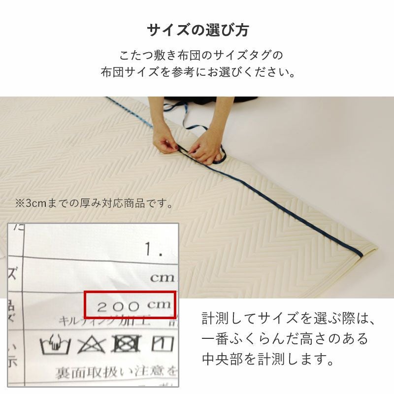 サイズタグに記載されているこたつ敷き布団のサイズを参考に、分厚いこたつ敷き布団の場合は直径+厚みの大きいサイズで作るのがおすすめです。※3cmの厚みまで対応。