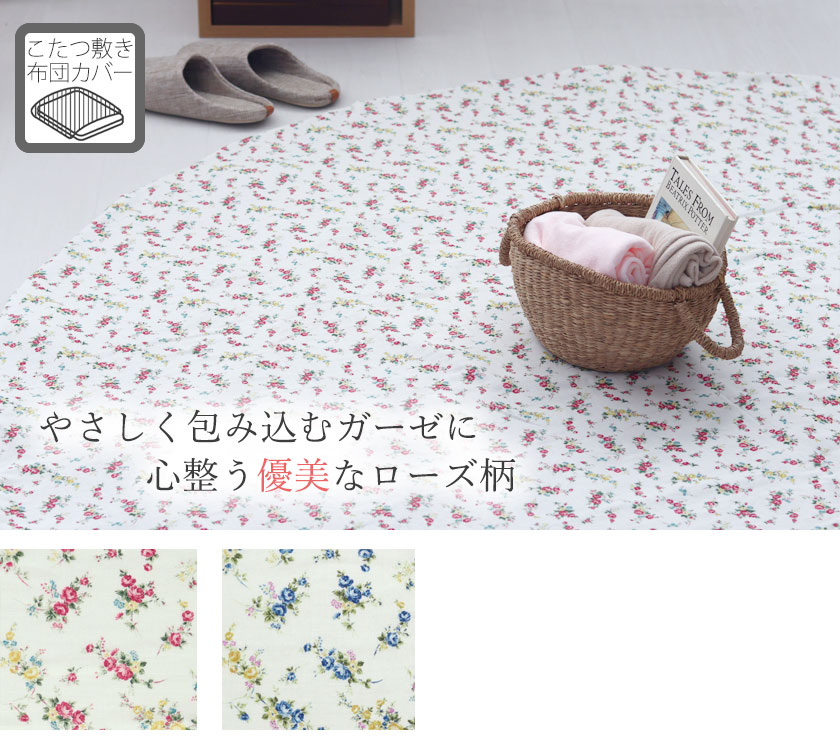 綿100%ダブルガーゼ、エレガントなローズ柄のこたつ敷き布団カバー円形。お部屋が一気に華やかになるお花柄で冬もほっこり。洗うたび、ふっくらふわふわな心地よさ。日本製