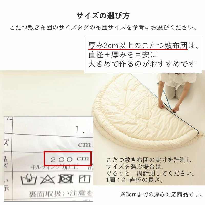 サイズタグに記載されているこたつ敷き布団のサイズを参考に、分厚いこたつ敷き布団の場合は直径+厚みの大きいサイズで作るのがおすすめです。※3cmの厚みまで対応。