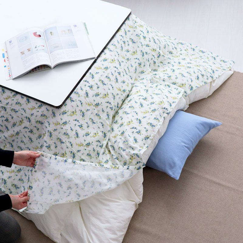 自由度が高いこたつ上掛けは、こたつ布団の上に掛けて使用します。こたつ上掛けのサイズは、こたつ布団のサイズタグの布団サイズを参考にお選びください。布団を完全に覆いたい場合は、お好みに合わせて+5cmなど少し大きめサイズをお選びください。