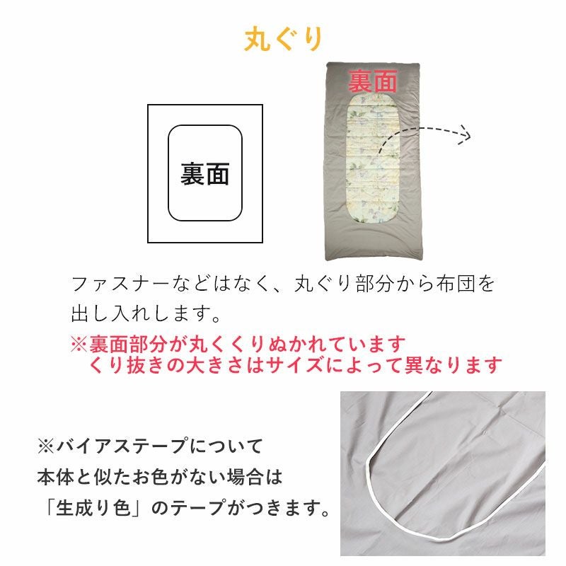 丸ぐりタイプは留め具が何もつかない裏面部分が丸くくりぬかれているカバーになります。布団入れ口のオプション項目で丸ぐりをお選びください。