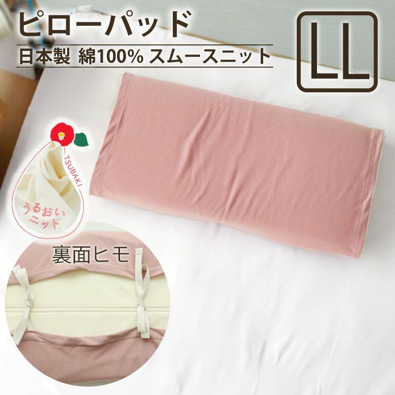 大きなサイズの枕にも対応!伸縮性抜群のピローパッドLLサイズ。椿オイル配合で滑らかなスムースニットはお肌にもやさしい生地です。裏面のヒモで枕にぴったりフィット!綿100%、日本製