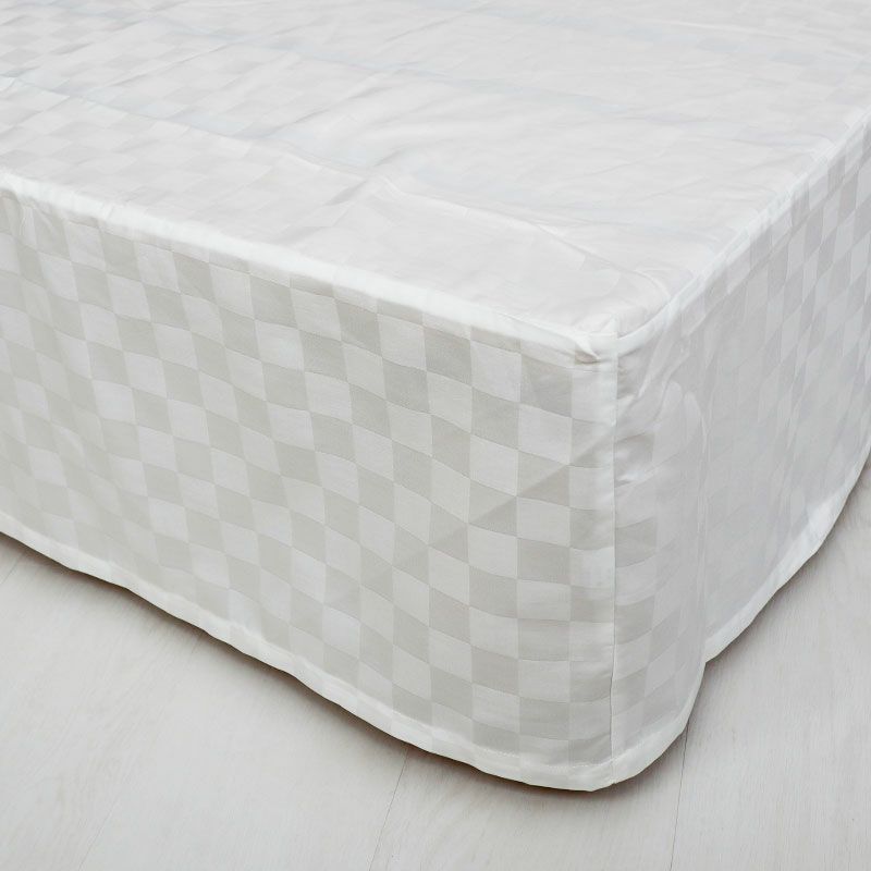 スタイリッシュなサテンチェックのベッドスカート(ボックスタイプ)で、まるでホテルのような寝室に!ベッドフレームに被せるだけの簡単仕様で楽々。高級感溢れる昼夜織りの美しい格子柄。ワイドダブル・クイーンサイズ、綿100%、日本製