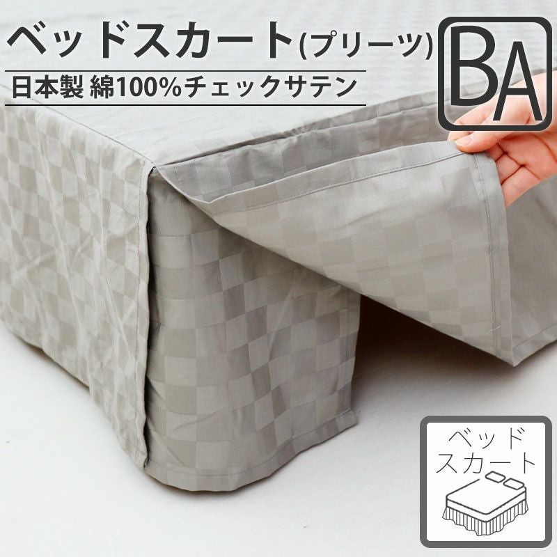 ベッドの高さに合わせられる、落ち着いた光沢のチェック柄のベッドスカート(プリーツタイプ)ベビーサイズ。家族の寝室にもマッチする昼夜織りの美しいサテン生地。綿100%日本製。