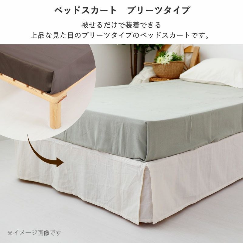 どんな寝室にも合わせやすいナチュラルで落ち着くカラーのベッドスカート(プリーツタイプ)、ジュニア・セミシングルサイズ。ベッドフレームに被せるだけで寝室をスッキリと見せてくれます。良質なオーガニックコットン100%使用。日本製