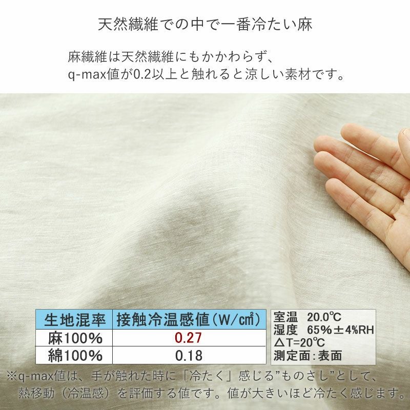 - 吸湿発散性に優れ、熱伝導率が高い、麻(リネン)100%使用し、ひんやり涼しい
