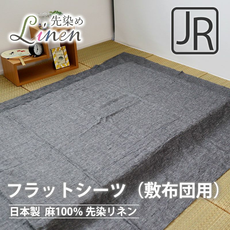 60先染めフランスリネンのひんやり涼しい麻(リネン)100%のフラットシーツ敷き布団用ジュニアサイズ。麻特有のシャリ感を残しつつ、クールクラッシュ加工でソフトで柔らかい仕上がりなので暑い夏にお子様にもおすすめです。安心安全の日本製です。