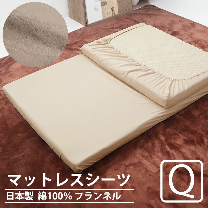 ゆったり使えるワイドダブル・クイーンサイズのマットレスシーツ。綿100%のコットンフランネル生地は柔らかくふっくらあたたかい、冬におすすめの生地です。天然繊維で蒸れにくく、裏面ゴムで装着も簡単!安心の日本製