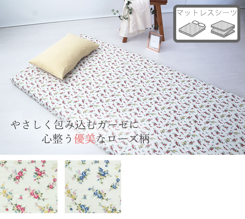 洗うたびふっくらふわふわな心地よさ!エレガントなローズ柄で寝室が一気に華やかに変身!柄なので汚れも目立ちにくく、綿100%ダブルガーゼのマットレスシーツセミダブル。日本製