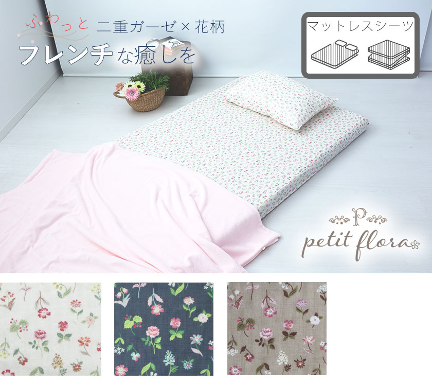 無地のカバーとのコーディネートも楽しめるかわいいお花がぎゅっと詰まったフレンチカジュアルなお花柄。洗うたびにふっくらふわふわ綿100%ダブルガーゼの日本製マットレスシーツセミダブル