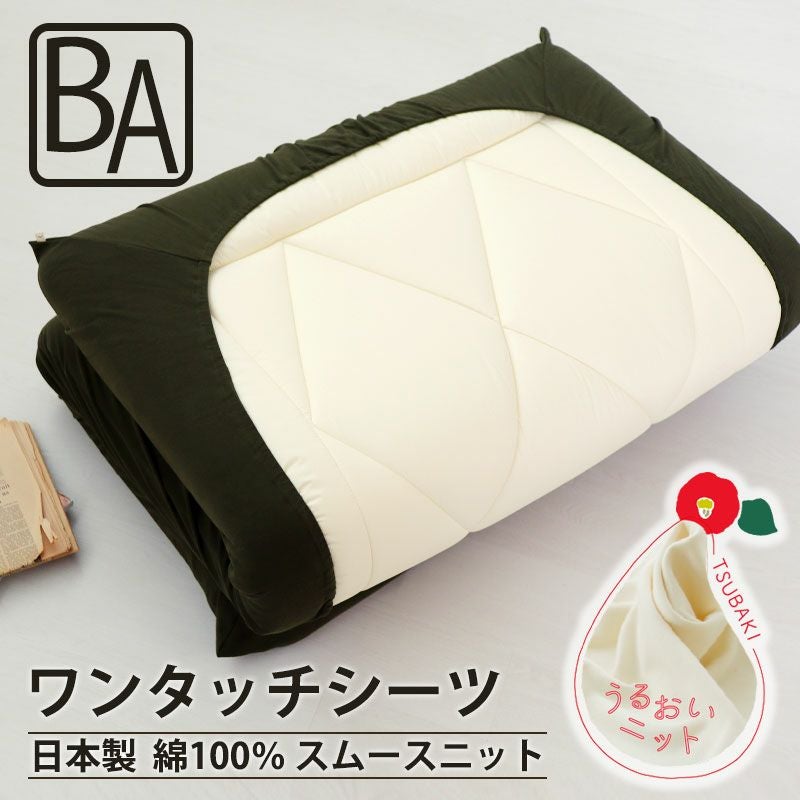 全周ゴムで被せるだけで装着できる、脱着楽々なワンタッチシーツベビーサイズ。オーガニックコットン100%使用した、伸縮性の良い、しっとり保湿力のあるスムースニット。安心の日本製シーツ。