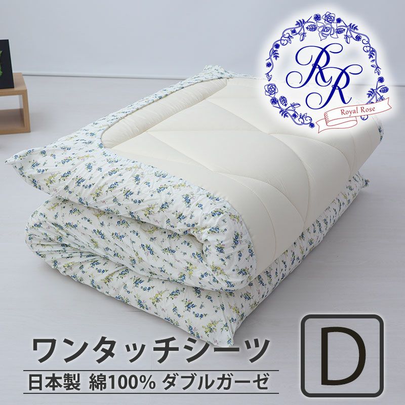 花柄のデザインで汚れが目立ちにくい!優美なローズ柄が寝室を一気に華やかにする!洗うたび、ふっくらふわふわな心地よさの綿100%ダブルガーゼのワンタッチシーツダブル。日本製