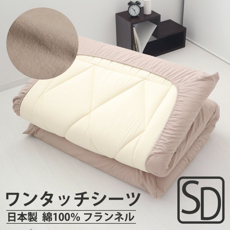 冬におすすめの微起毛加工であたたかいコットンフランネルワンタッチシーツのセミダブルサイズ。綿100%の優しい暖かさとお部屋に馴染む落ち着いたカラー展開。裏面ゴム使用でひとりでも着脱がラクチン♪安心の日本製