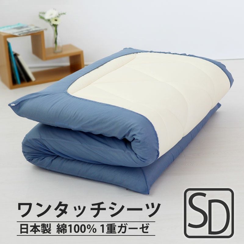 オーガニックコットン100%使用した細番手の高品質な一重ガーゼ。しなやかでサラッとしたやさしい肌触りで夏以外も一年中快適。裏面全周ゴムで脱着が楽なワンタッチシーツセミダブルサイズ。日本製