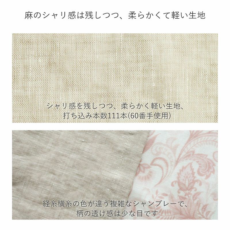 アパレルなどで使用されることも多い、先染めのリネン。糸自体にしっかりと染色されているため、色落ちしにくく、深みのある色合いに仕上がります。タテは白糸、ヨコは色糸のシャンブレーは見る位置により色合いが変化して見える奥行きがあり、ほどよい光沢が出るので上品でナチュラルな印象に。時間がかかる分、後染めでは出せないような風合いになるのが特徴です。